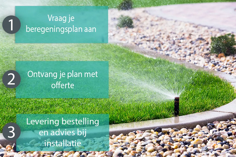 Door het grote aanbod van verschillende beregeningsmaterialen is het soms moeilijk om door de bomen het bos nog te zien. Een beregeningsinstallatie kan een behoorlijke aankoop zijn. Daarom wil je natuurlijk zeker weten dat je het juiste koopt. Het is zonde wanneer je tijd, moeite en geld in een plan steekt om alsnog met uitgedroogde planten te zitten doordat er een hoekje over het hoofd gezien is. Met een beregeningsplan plan je zorgvuldig en van te voren jouw beregeningsinstallatie. Doormiddel van een gedetailleerde tekening en materiaallijst zorg je dat jouw beregeningsinstallatie van te voren bij de tuin past. Wij helpen je graag verder met het maken van een beregeningsplan en materiaallijst. Onze specialisten staan voor je klaar en zorgen ervoor dat de beregeningsinstallatie straks perfect bij de eisen van jouw tuin aansluit.