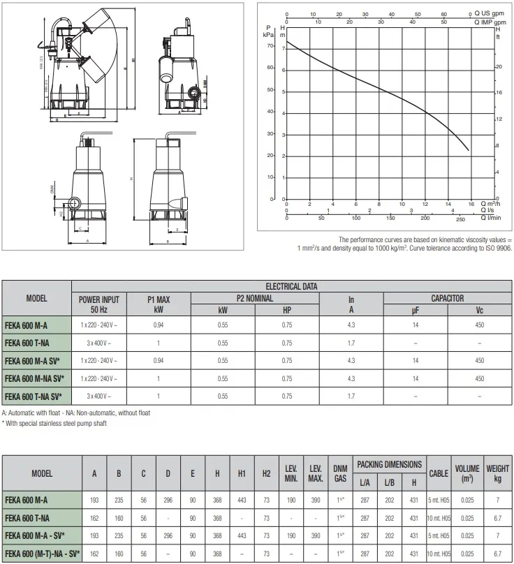 De DAB Feka 600 M-A is geschikt voor continu gebruik en heeft een ingebouwde thermische beveiliging. De pomp heeft een maximale pompcapaciteit van 15.000 liter per uur en een maximale opvoerhoogte van 8 meter (0,8 bar). De DAB Feka 600 M-A is een 230V pomp met een vermogen van 0,5 kW en wordt standaard geleverd met 10 meter stroomkabel.
