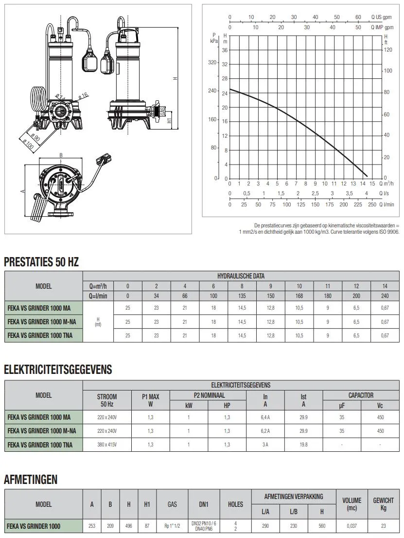 De DAB Feka VS Grinder 1000 T-NA is geschikt voor continu gebruik. De pomp heeft een maximale pompcapaciteit van 14.000 liter per uur en een maximale opvoerhoogte van 25 meter (2,5 bar). De DAB Feka VS Grinder 1000 T-NA is een 400V pomp met een vermogen van 1 kW.
