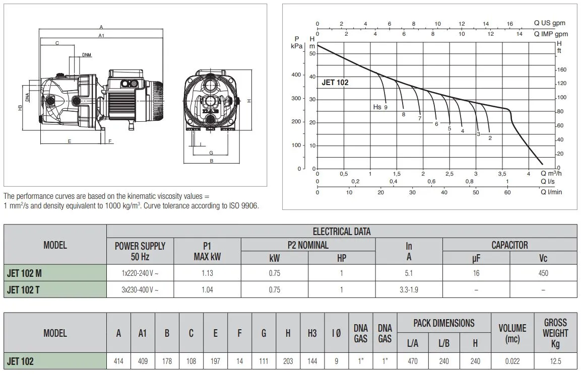 De DAB Jet 102 M is geschikt voor continu gebruik en kan tot 8 meter diep het water aanzuigen. De pomp heeft een maximale pompcapaciteit van 3.600 liter per uur en een maximale opvoerhoogte van 53 meter (5,3 bar). De DAB Jet 102 T is een 400V pomp met een vermogen van 0,75 kW en wordt standaard geleverd zonder aansluitkabel/stroomkabel.