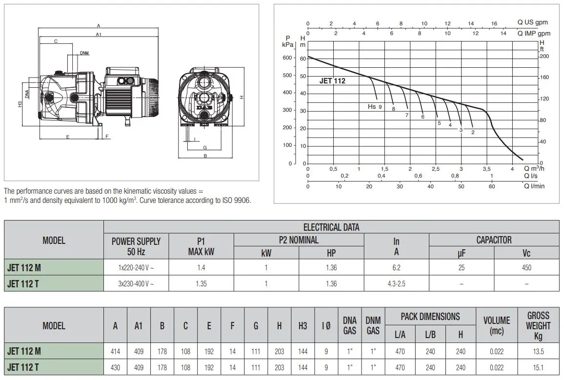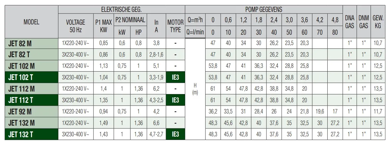 De DAB Jet 112 M is geschikt voor continu gebruik en kan tot 8 meter diep het water aanzuigen. De pomp heeft een maximale pompcapaciteit van 3.600 liter per uur en een maximale opvoerhoogte van 61 meter (6,1 bar). De DAB Jet 112 M is een 230V pomp met een vermogen van 1 kW en wordt standaard geleverd zonder aansluitkabel/stroomkabel.