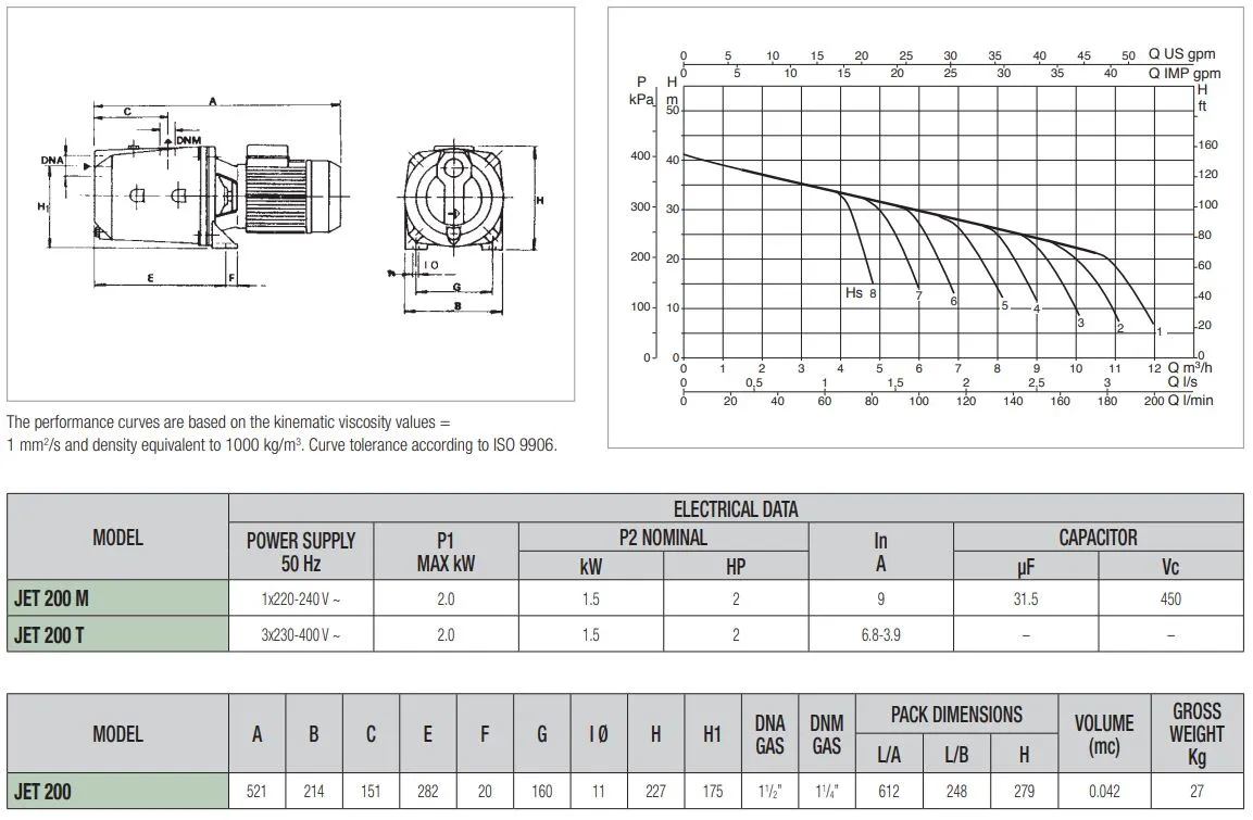 De DAB Jet 200 T is geschikt voor continu gebruik en kan tot 8 meter diep het water aanzuigen. De pomp heeft een maximale pompcapaciteit van 10.500 liter per uur en een maximale opvoerhoogte van 41 meter (4,1 bar). De DAB Jet 200 T is een 400V pomp met een vermogen van 1,5 kW en wordt standaard geleverd zonder aansluitkabel/stroomkabel.