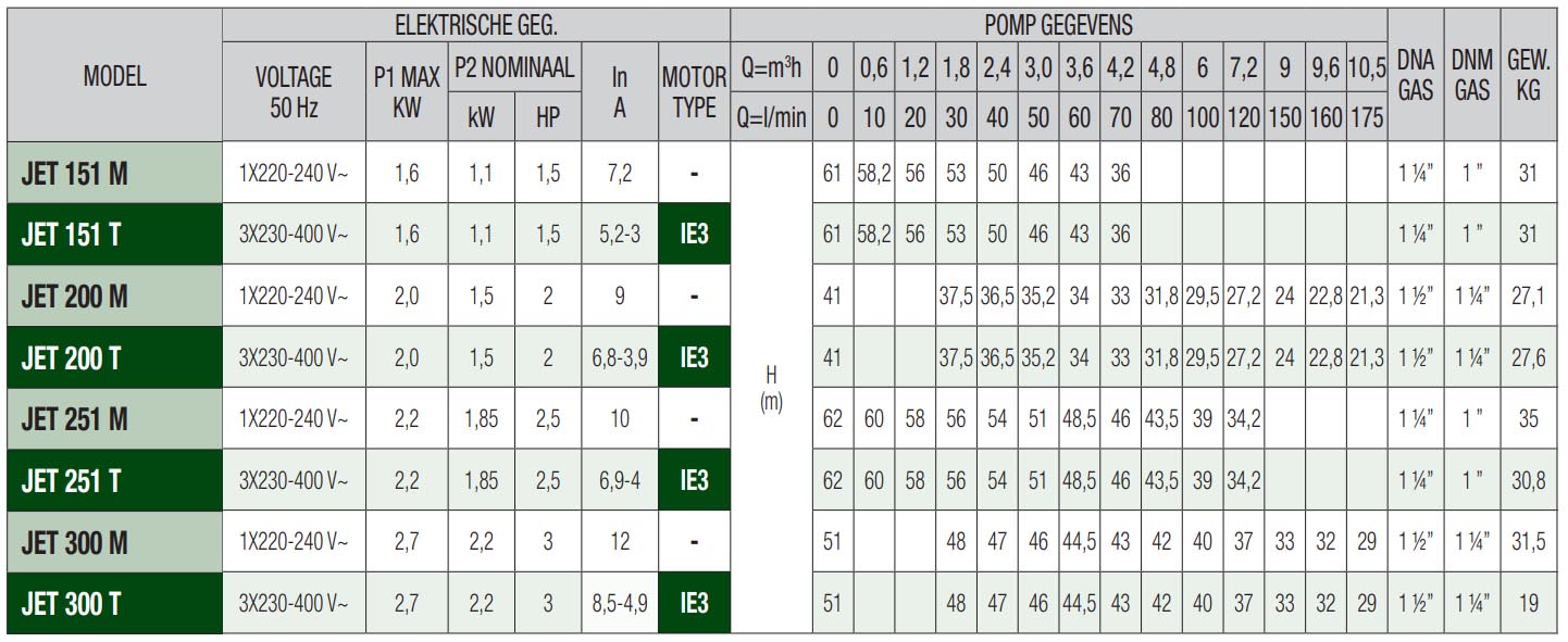 De DAB Jet 251 M is geschikt voor continu gebruik en kan tot 8 meter diep het water aanzuigen. De pomp heeft een maximale pompcapaciteit van 7.200 liter per uur en een maximale opvoerhoogte van 62 meter (6,2 bar). De DAB Jet 251 M is een 230V pomp met een vermogen van 1,85 kW en wordt standaard geleverd zonder aansluitkabel/stroomkabel.