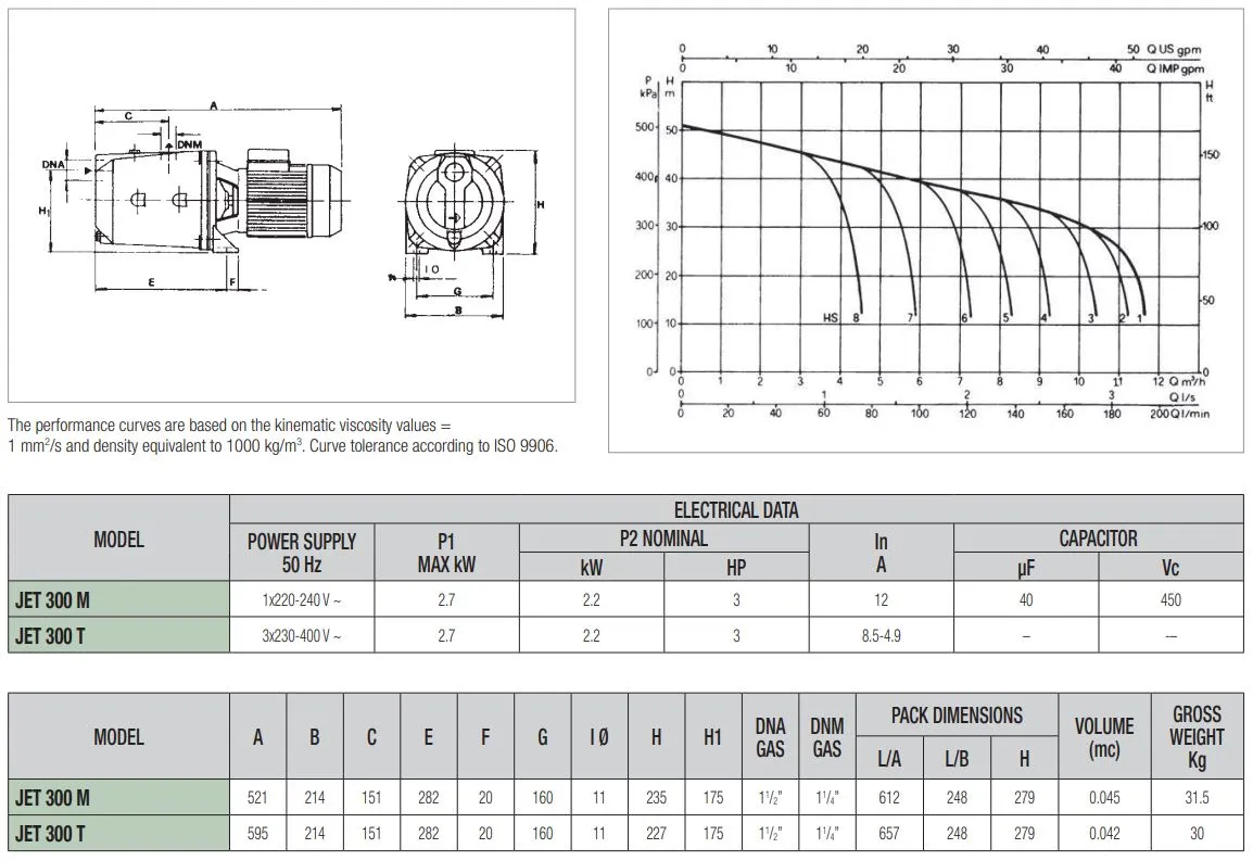 De DAB Jet 300 M is geschikt voor continu gebruik en kan tot 8 meter diep het water aanzuigen. De pomp heeft een maximale pompcapaciteit van 10.500 liter per uur en een maximale opvoerhoogte van 51 meter (5,1 bar). De DAB Jet 300 M is een 230V pomp met een vermogen van 2,2 kW en wordt standaard geleverd zonder aansluitkabel/stroomkabel.