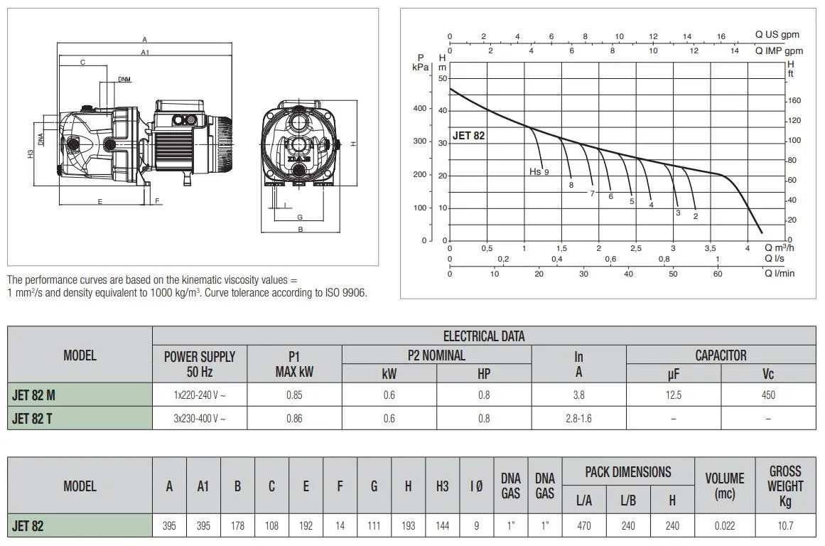 De DAB Jet 82 T is geschikt voor continu gebruik en kan tot 8 meter diep het water aanzuigen. De pomp heeft een maximale pompcapaciteit van 3.600 liter per uur en een maximale opvoerhoogte van 47 meter (4,7 bar). De DAB Jet 82 T is een 400V pomp met een vermogen van 0,6 kW en wordt standaard geleverd zonder aansluitkabel/stroomkabel.