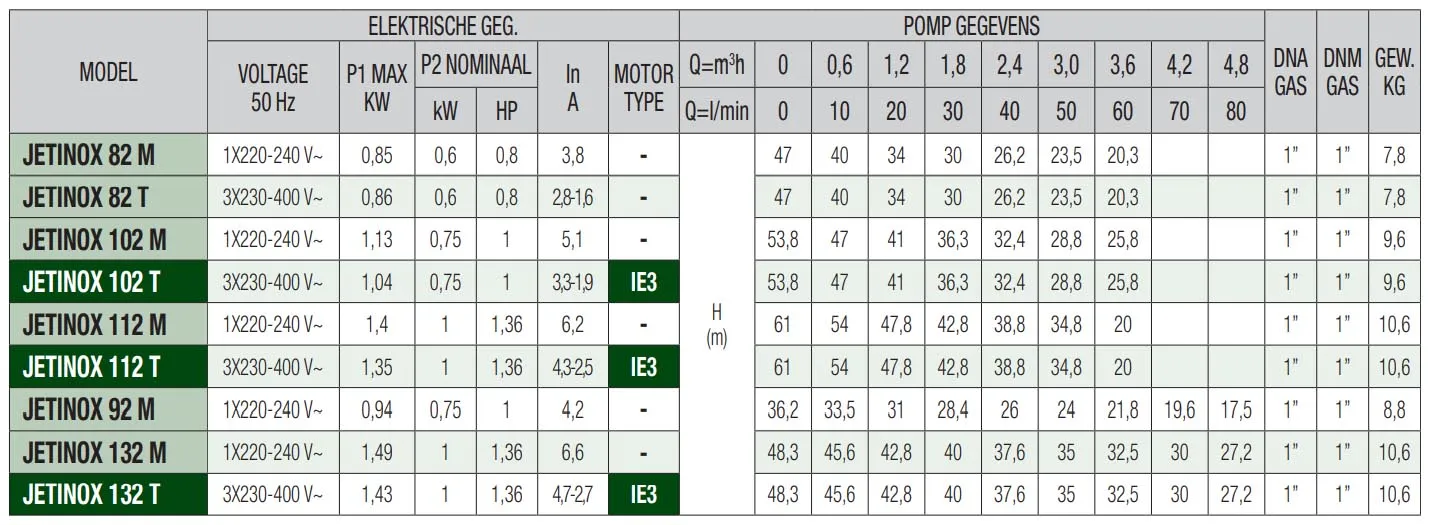 De DAB Jetinox 102 M is geschikt voor continu gebruik en kan tot 8 meter diep het water aanzuigen. De pomp heeft een maximale pompcapaciteit van 3.600 liter per uur en een maximale opvoerhoogte van 53 meter (5,3 bar). De DAB Jetinox 102 M is een 230V pomp met een vermogen van 0,75 kW en wordt standaard geleverd zonder aansluitkabel/stroomkabel.