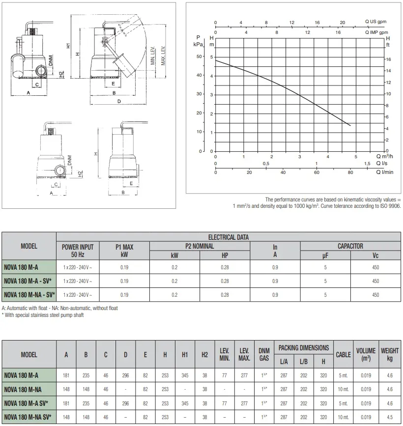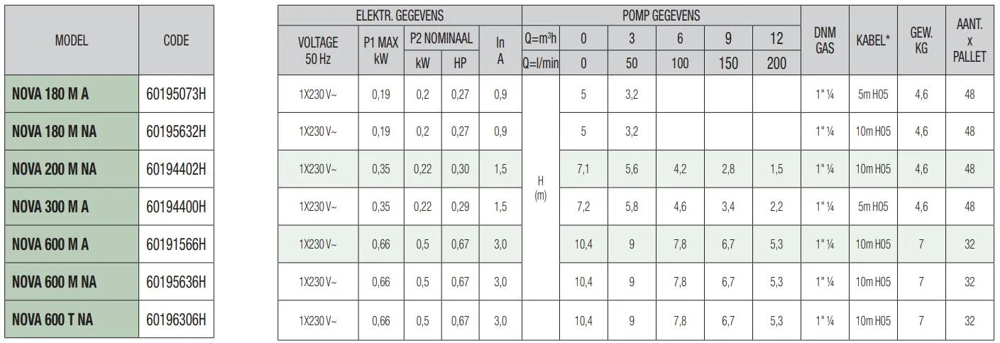 De DAB Nova 180 M-NA is geschikt voor continu gebruik en heeft een ingebouwde thermische beveiliging. De pomp heeft een maximale pompcapaciteit van 5.000 liter per uur en een maximale opvoerhoogte van 5 meter (0,5 bar). De DAB Nova 180 M-NA is een 230V pomp met een vermogen van 0,20 kW en wordt standaard geleverd met 10 meter stroomkabel.