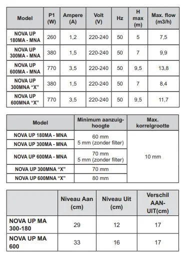 De DAB Nova Up 600 M-AE is geschikt voor continu gebruik en heeft een ingebouwde thermische beveiliging. De pomp heeft een maximale pompcapaciteit van 9.000 liter per uur en een maximale opvoerhoogte van 7 meter (0,7 bar). De DAB Nova Up 600 M-AE is een 230V pomp en heeft een vermogen van 0,21 kW.