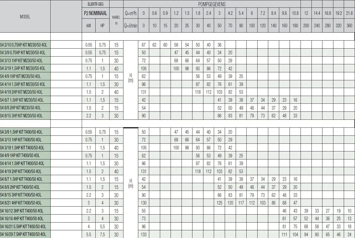 De Dab S4 4/19 2HP KIT M230/50 4OL bronpomp is een gebruiksvriendelijke, compacte meertraps-centrifugale bronpomp voor putten van 4'' of groter met een breed scala aan wateropbrengsten en opvoerhoogtes. Deze pomp is de opvolger van de DAB S4 D 17M kit. De Dab S4 pomp heeft talloze toepassingsmogelijkheden in het opvoeren, distribueren en onder druk brengen van water in particuliere en industriële waterleidingsinstallaties. Ook voor toevoer van autoclaven en putten, brandblusinstallaties, wasinstallaties en irrigatiesystemen is deze DAB bronpomp geschikt.