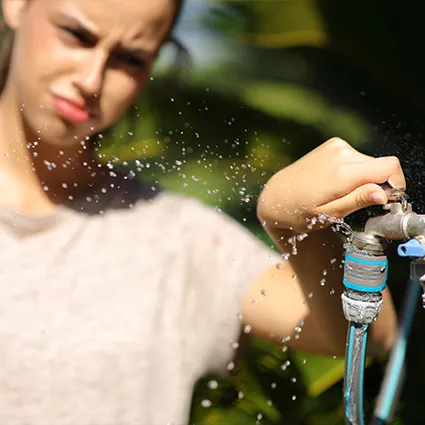 Aan de andere kant van de tyleenslang maak je dezelfde PE koppeling vast aan een tuinslang verdeelstuk of direct aan de buitenkraan. Natuurlijk kun je ook verbindingen maken met bestaande druppelinstallaties. Dit doe je met T-stuk of een ander druppelslang hulpstuk. Maak alle uiteindes van je druppelslang dicht met een druppelslang eindplug of druppelslang afdichtstop.
