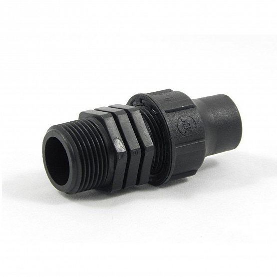 Dit puntstuk buitendraad koppeling heeft aan een zijde een knelkoppeling waar de druppelslang op aan gesloten kan worden. Aan de andere zijde bevind zich een aansluiting met 1'' buitendraad. Deze koppeling is ook leverbaar met een 3/4'' en 1'' buitendraad aansluiting.