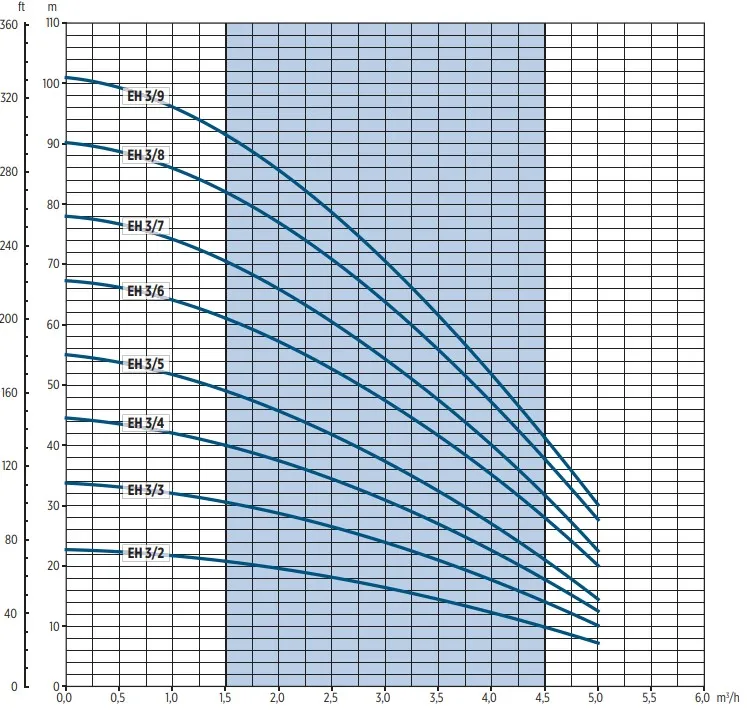 De Franklin EH 3/5 is niet-zelfaanzuigend en dient te worden gemonteerd met een terugslagklep. De pomp heeft een maximale pompcapaciteit 4.500 van liter per uur en een maximale opvoerhoogte van 49 meter (4,9 bar). De Franklin EH 3/5 is een 230V pomp met een vermogen van 0,75 kW en wordt standaard geleverd zonder aansluitkabel/stroomkabel.