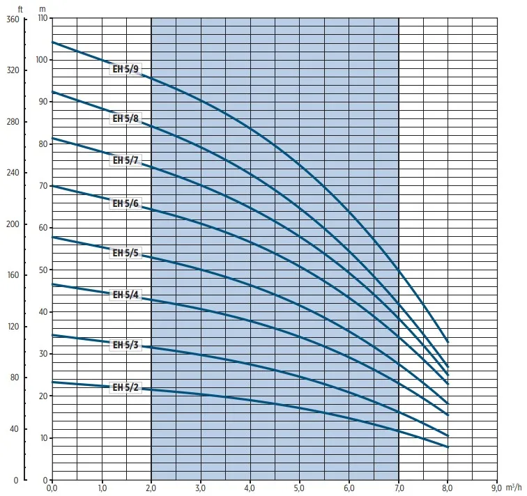 De Franklin EH 5/6 is niet-zelfaanzuigend en dient te worden gemonteerd met een terugslagklep. De pomp heeft een maximale pompcapaciteit van 7.000 liter per uur en een maximale opvoerhoogte van 64 meter (6,4 bar). De Franklin EH 5/6 is een 400V pomp met een vermogen van 1,3 kW en wordt standaard geleverd zonder aansluitkabel/stroomkabel.
