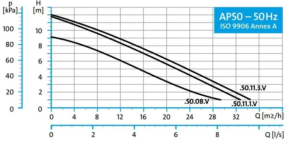 De Grundfos AP50 50.08.A3 beschikt over een koelmantel die de motor continu koelt met de verpompte vloeistof. De pomp heeft een maximale pompcapaciteit van 29.000 liter per uur en een maximale opvoerhoogte van 9 meter (0,9 bar). De Grundfos AP50 50.08.A3 is een 400V pomp met een vermogen van 1,3 kW en wordt standaard geleverd met 10 meter stroomkabel(zonder stekker).