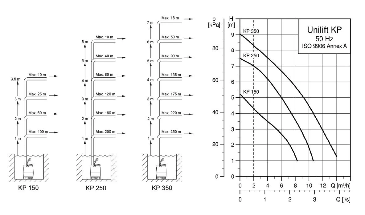 De Grundfos Unilift KP150 AV1 beschikt over een koelmantel en heeft een ingebouwde thermische beveiliging. De pomp heeft een maximale pompcapaciteit van 8.000 liter per uur en een maximale opvoerhoogte van 5 meter (0,5 bar). De Grundfos Unilift KP150 AV1 is een 230V pomp met een vermogen van 0,33 kW en wordt standaard geleverd met 5 meter stroomkabel.