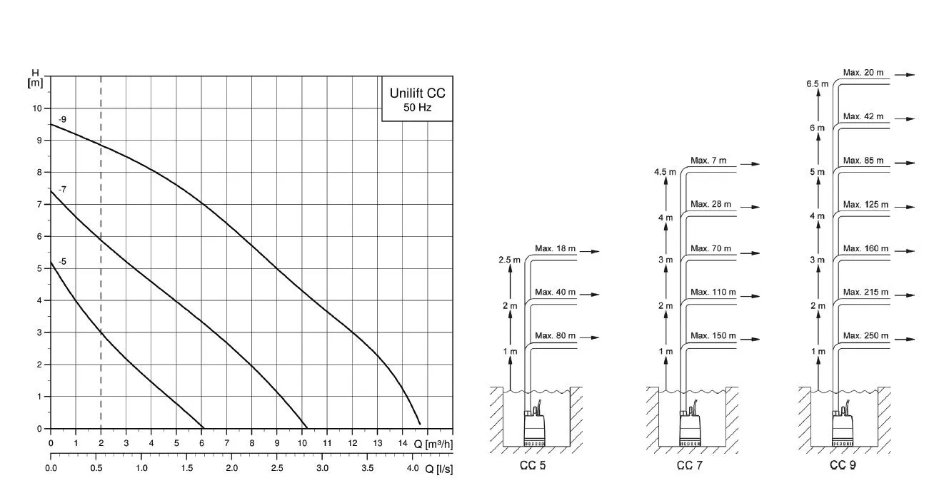 De Grundfos Unilift CC 7 A1 beschikt over een geïntegreerde ontluchtingsklep en heeft een ingebouwde thermische beveiliging. De pomp heeft een maximale pompcapaciteit van 10.000 liter per uur en een maximale opvoerhoogte van 7 meter (0,7 bar). De Grundfos Unilift CC 7 A1 is een 230V pomp met een vermogen van 0,23 kW en wordt standaard geleverd met 10 meter stroomkabel.