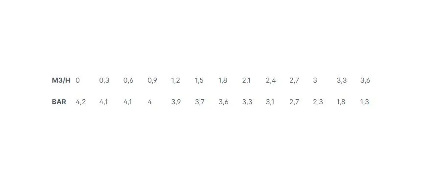 | M3/H | 0 | 0,3 | 0,6 | 0,9 | 1,2 | 1,5 | 1,8 | 2,1 | 2,4 | 2,7 | 3 | 3,3 | 3,6 |