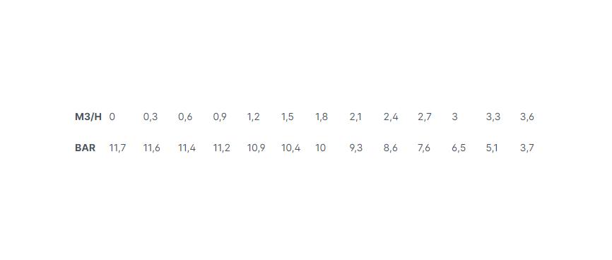 | M3/H | 0 | 0,3 | 0,6 | 0,9 | 1,2 | 1,5 | 1,8 | 2,1 | 2,4 | 2,7 | 3 | 3,3 | 3,6 |