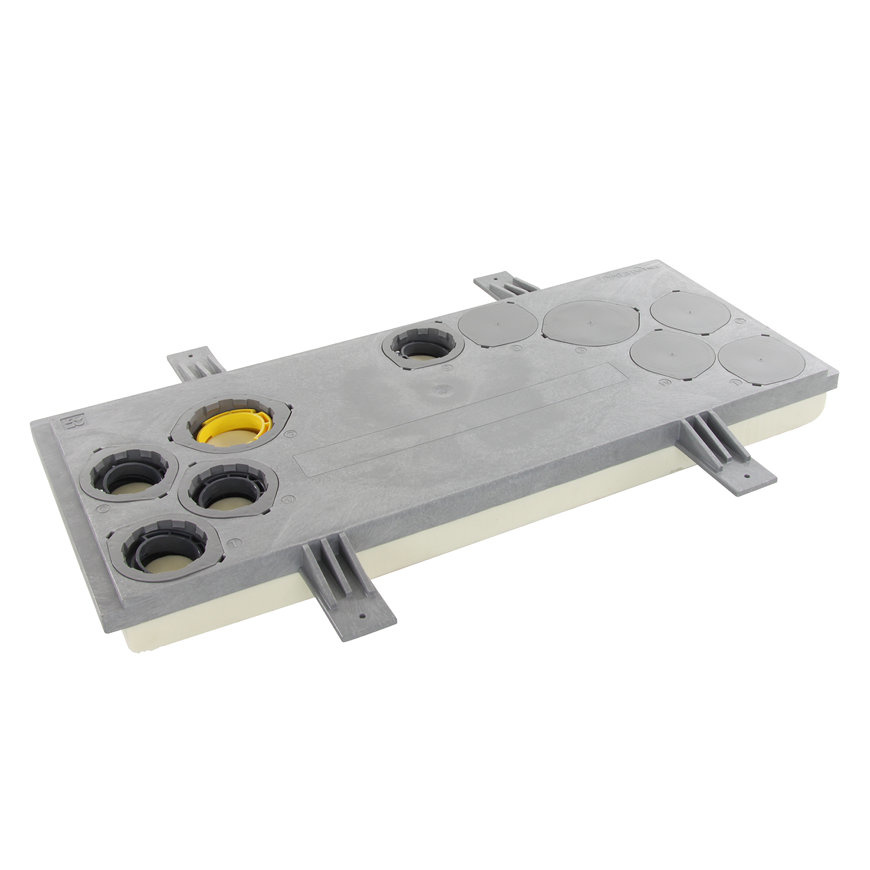 Deze versie wordt geleverd met. Hiermee houdt het koude luchtstroming tegen vanuit de kruipruimte. In totaal beschikt de meterkastvloerplaat over 2 x Ø63 mm uitsparingen en 8 x Ø50 mm uitsparingen. Hiermee bent u verzekerd van voldoende doorvoerpunten.