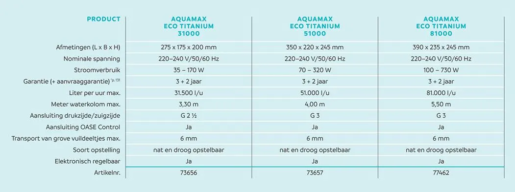 De Oase AquaMax Eco Titanium 31000 vijverpomp is een doeltreffende krachtpatser voor grote gravitatiefilterinstallaties. Dankzij het hoogwaardige materiaal van keramiek en RVS is de pomp robuust, duurzaam en bijzonder efficiënt. De Eco Titanium kan zowel nat als droog opgesteld worden en is ook geschikt voor zeewater.