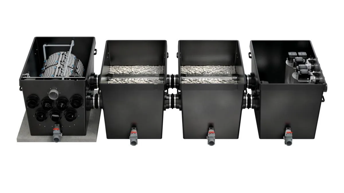 De Moving Bed module staat hierbij twee keer in het midden, dit zorgt dat het water zo schoon mogelijk is, voordat het terug de vijver in gaat.