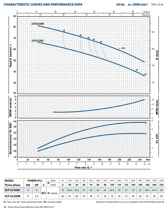 De Pedrollo 2CP 32/200C is niet-zelfaanzuigend en dient te worden gemonteerd met een terugslagklep. De pomp heeft een maximale pompcapaciteit van 15.000 liter per uur en een maximale opvoerhoogte van 70 meter (7,0 bar). De Pedrollo 2CP 32/200C is een 400V pomp met een vermogen van 3,0 kW en wordt standaard geleverd zonder aansluitkabel/stroomkabel.