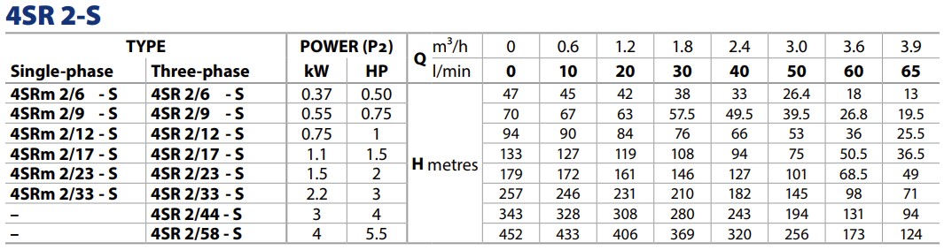 De 4SR2/12-S heeft een motorvermogen nodig van 1 PK / 0,75KW. in een 230v. of 400v. uitvoering.