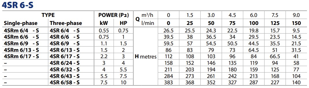 De 4SR6/6-S heeft een motorvermogen nodig van 1 PK / 0,75 KW. in een 230v. of 400v. uitvoering.