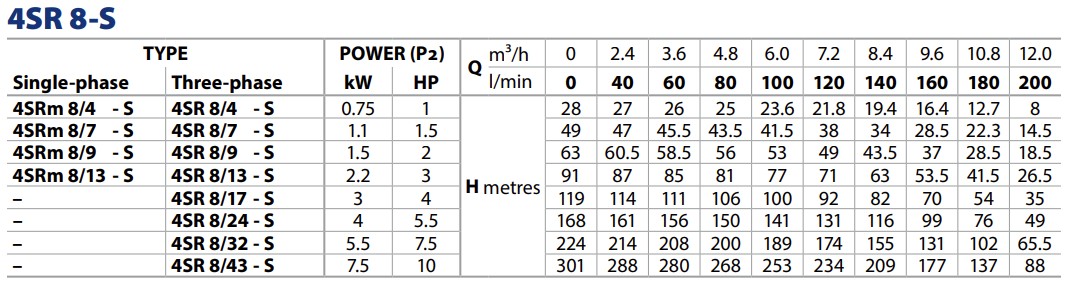 De 4SR8/7-S heeft een motorvermogen nodig van 1,5 PK / 1,1 KW. in een 230v. of 400v. uitvoering.
