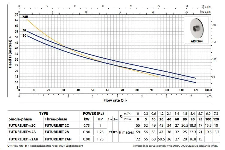 De Pedrollo Future JETm 2C is met een aanzuigdiepte van 9 meter zeer geschikt om op grote diepte water aan te zuigen. De pomp heeft een maximale pompcapaciteit van 6.600 liter per uur en een maximale opvoerhoogte van 32 meter (3,2 bar). De Pedrollo Future JETm 2A is een 230V pomp met een vermogen van 0,75 kW en wordt standaard geleverd met aansluitkabel/stroomkabel.