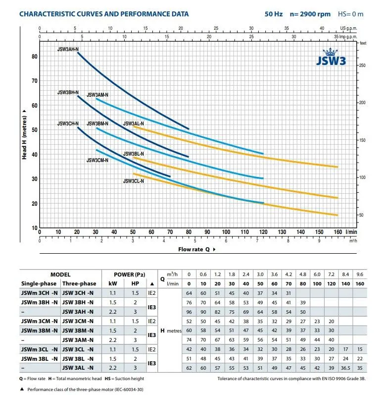 De Pedrollo JSW/3AH is met een aanzuigdiepte van 9 meter zeer geschikt om op grote diepte water aan te zuigen. De pomp heeft een maximale pompcapaciteit van 4.800 liter per uur en een maximale opvoerhoogte van 90 meter (9,0 bar). De Pedrollo JSW/3AH is een 400V pomp met een vermogen van 2,2 kW en wordt standaard geleverd zonder aansluitkabel/stroomkabel.