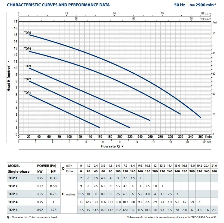 De Pedrollo Top 2 beschikt over een koelmantel en heeft een ingebouwde thermische beveiliging. De pomp heeft een maximale pompcapaciteit van 13.200 liter per uur en een maximale opvoerhoogte van 9 meter (0,9 bar). De Pedrollo Top 2 is een 230V pomp met een vermogen van 0,37 kW en wordt standaard geleverd met 10 meter stroomkabel.
