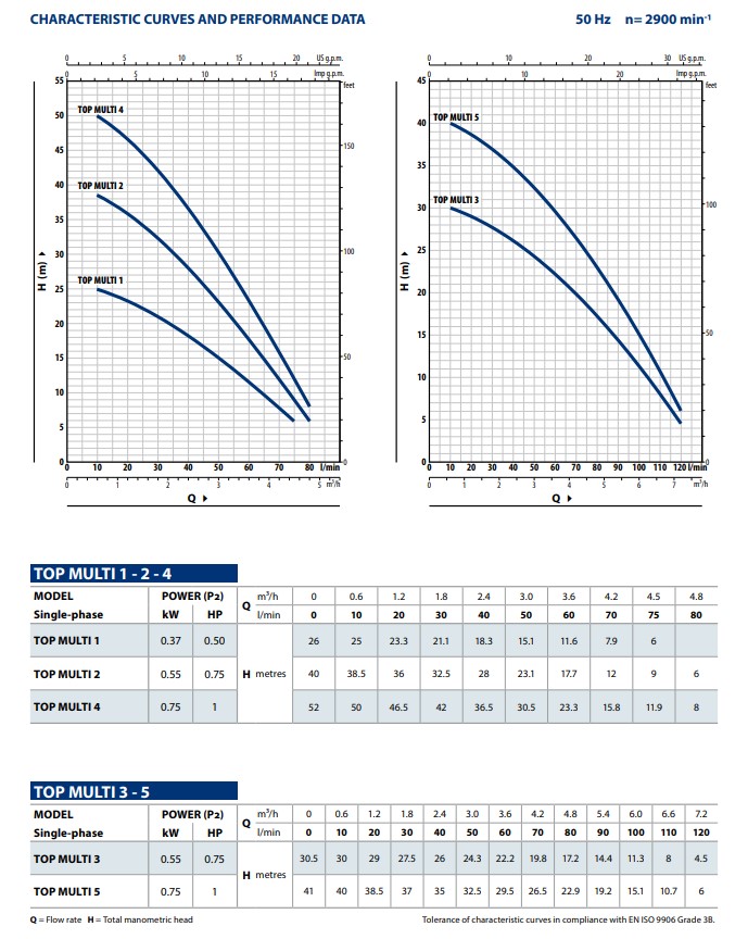 De Pedrollo Top Multi 2 beschikt over een dubbele mantel en heeft een ingebouwde thermische beveiliging. De pomp heeft een maximale pompcapaciteit van 4.800 liter per uur en een maximale opvoerhoogte van 42 meter (4,2 bar). De Pedrollo Top Multi 2 is een 230V pomp met een vermogen van 0,55 kW en wordt standaard geleverd met 10 meter stroomkabel.