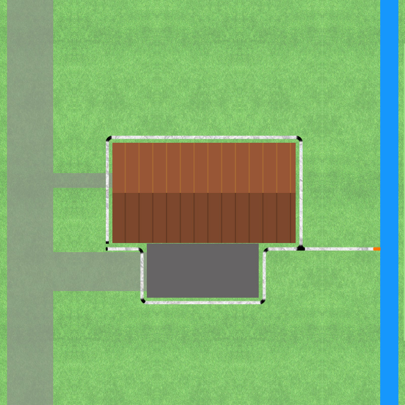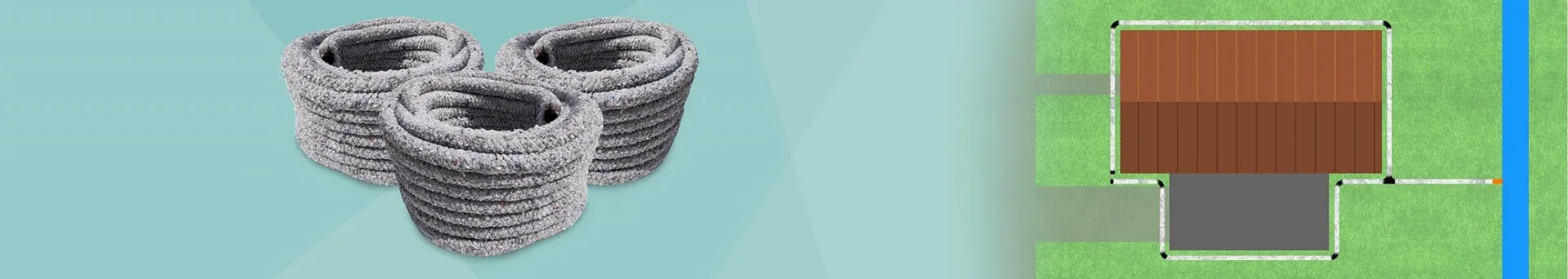 Voor een effectieve werking leg je deze buizen als een open ring om je woning. De opening is in de afbeelding zichtbaar bij de oprit. Hier sluit je beide bijeenkomende leidingen af met een eindkap. Dit geeft het systeem een zuigende werking. Bij een volledige dichte ring is dit niet het geval.
